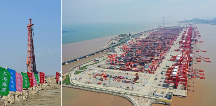 如今,洋山港已不仅是货物吞吐的枢纽,更是世界航运版图中一个耀眼的坐标。拼版照片:左图为2014年12月23日,上海洋山港四期工程打下第一桩(新华社发);右图为2022年9月23日无人机拍摄的上海洋山港四期自动化码头(新华社记者 丁汀 摄)。