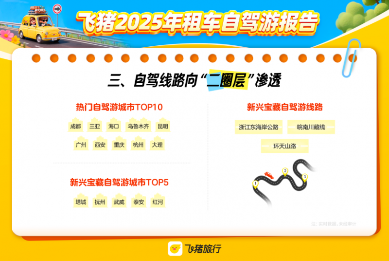 12月10日,飞猪发布的2025年新旅行洞察系列之《租车自驾游报告》显示,2025年租车用户数同比去年扩大近三成,人均租期超过6天。从取还车热门城市来看,成都、三亚、海口、乌鲁木齐、昆明、广州、西安、重庆、杭州、大理位列全国前十位。不难看出,中长线休闲自驾游与短线周边自驾游构成了国内自驾游两大特色,前者以西北、西南、华南的假日游为主,后者以一线城市及周边的“微度假”为主。