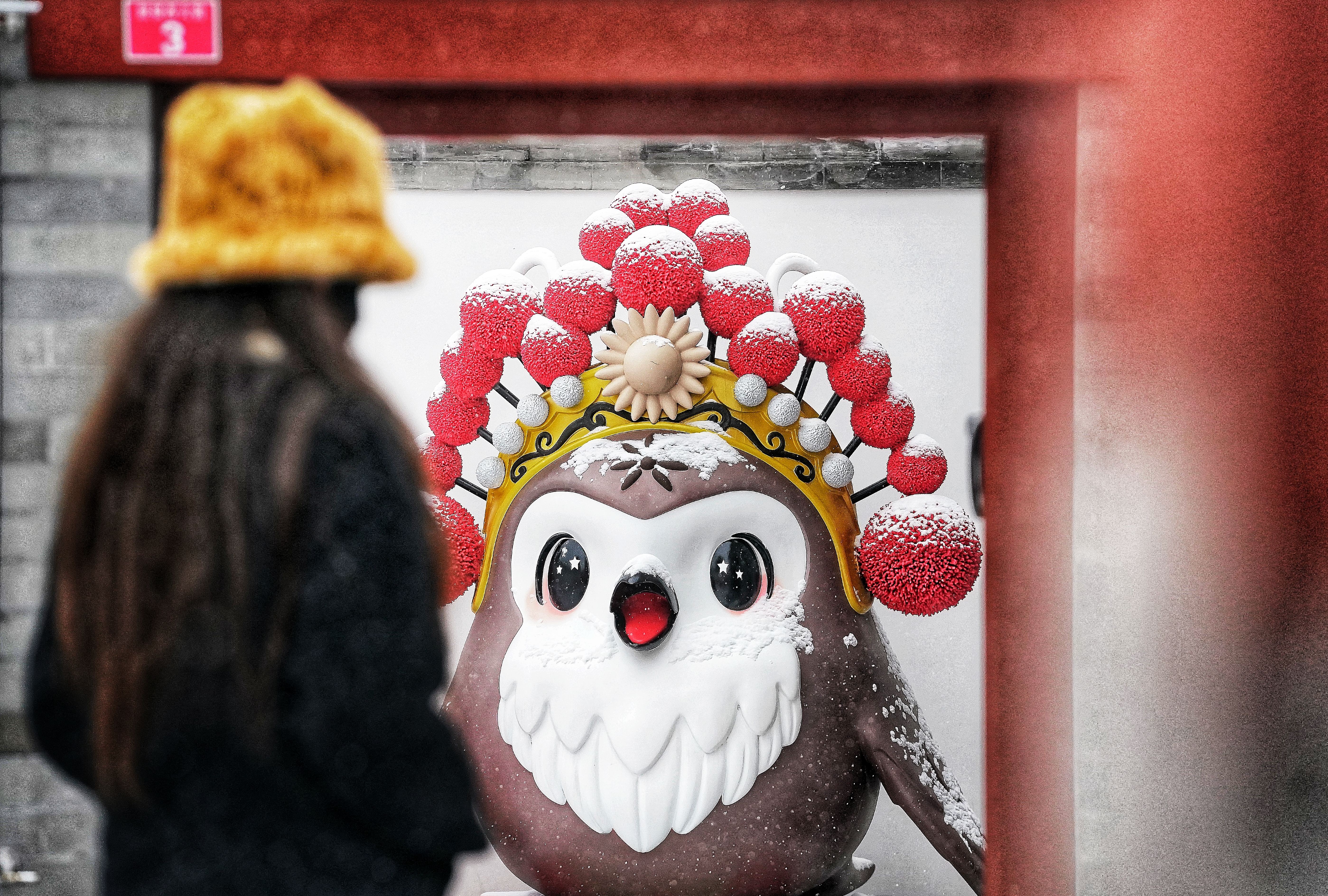 雪花纷纷扬扬,映衬着红墙灰瓦,古老建筑与白雪相映成趣,尽显古都韵味 。市民、游客陆续汇集在钟鼓楼和什刹海景区,沉浸在雪景与古建筑同框的美景之中,感受古韵交织的独特意境。