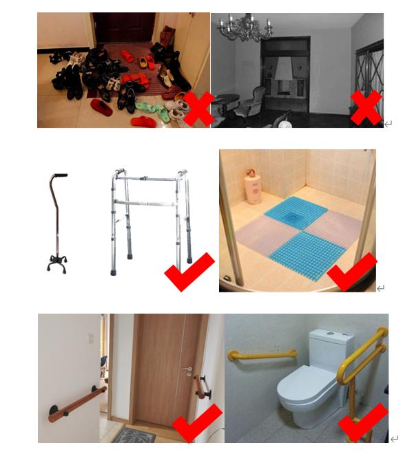 及时清理门口、台阶的积雪和薄冰;保持室内地面,尤其是厨房、卫生间干燥,铺上防滑垫;确保家中光线充足,夜间起床一定要开灯;常用物品放在伸手可及处,避免爬高或过度弯腰;家中关键位置(如卫生间、走廊)安装防摔倒扶手。