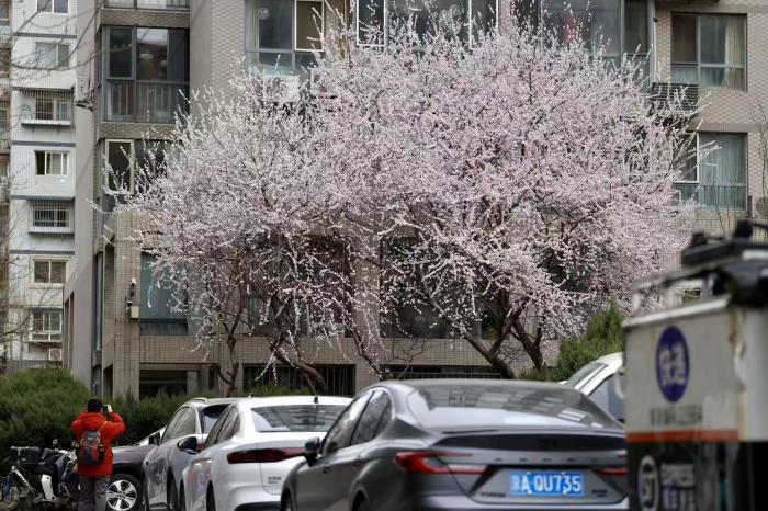 3月14日上午,北京东城区新景家园小区内三株相邻的山桃树迎来盛花期,粉白花朵层层叠缀,因树间距极近,在楼宇间织就一团蓬松的“花云”,成为市民春日打卡的热门点位。