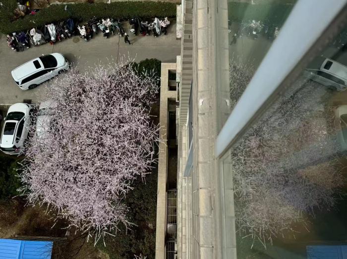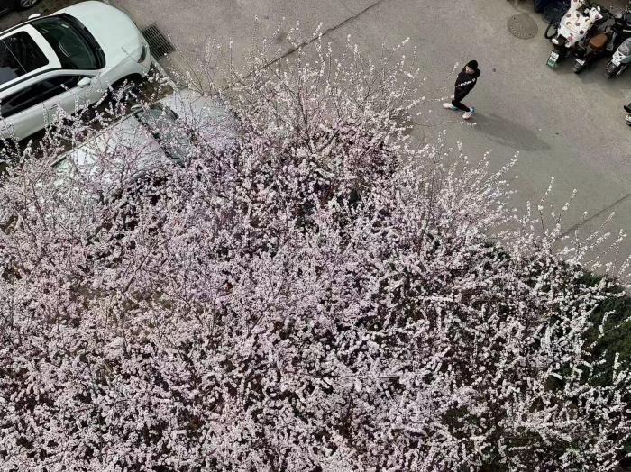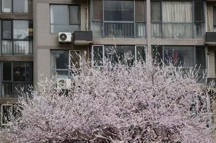三株山桃树并肩而立,花先于叶绽放,细密的枝条被粉白色小花包裹,远看如轻云落于楼前,与灰调的居民楼形成温柔反差。