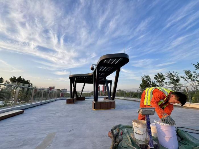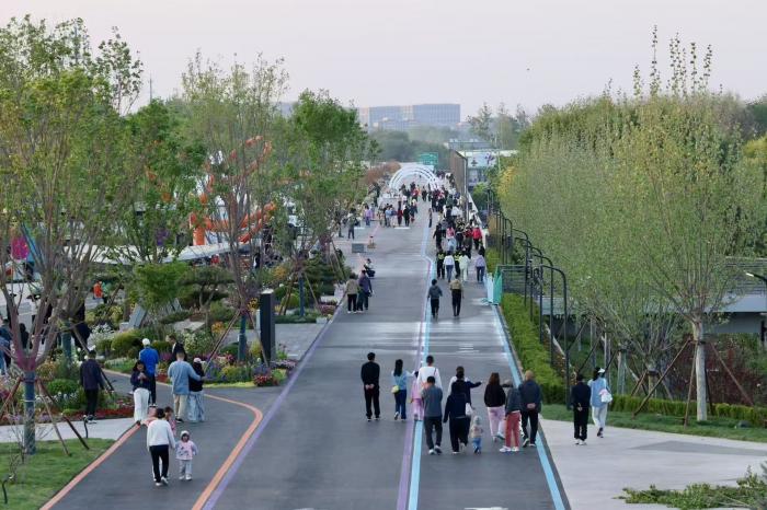北京城市副中心京华福满园示范段已进入开园前收尾调试,工人们正对标识、玻璃护栏做最后打磨,不少周边居民提前打卡,抢先体验这条由高速路基蜕变的线性绿廊。