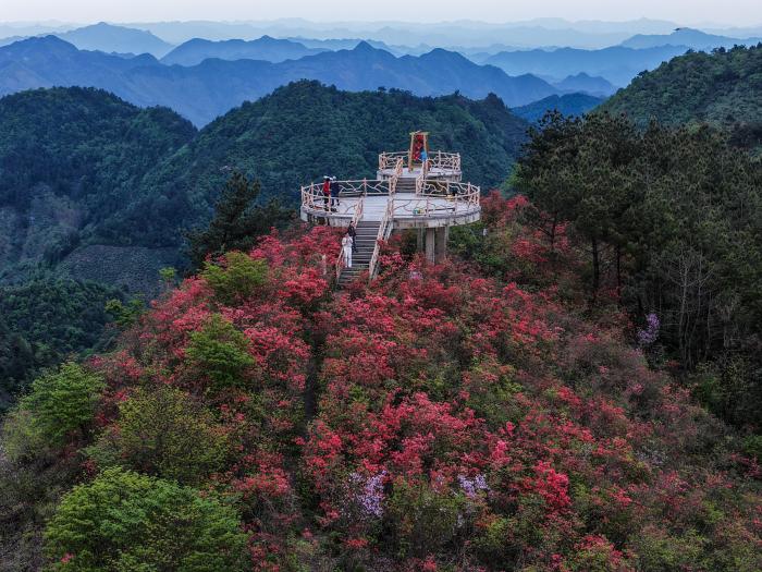 近期,浙江省杭州市淳安县屏门乡金陵村的数百亩高山野生杜鹃热烈绽放,吸引各地游客前来观赏。