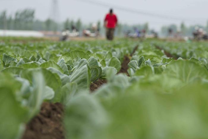 4月26日,河北省唐山市玉田县虹桥镇农民在菜田管护幼苗。新华社发(刘满仓摄)
