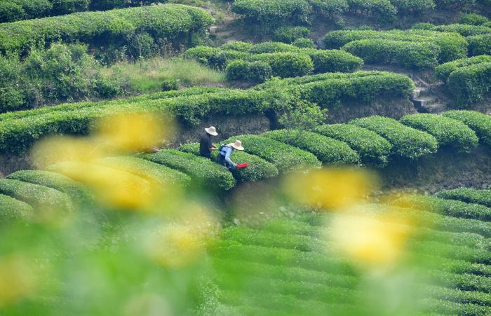 4月26日,茶农在三峡库区湖北省宜昌市秭归县茅坪镇一生态茶园里采摘春茶。新华社发(王辉富摄)
