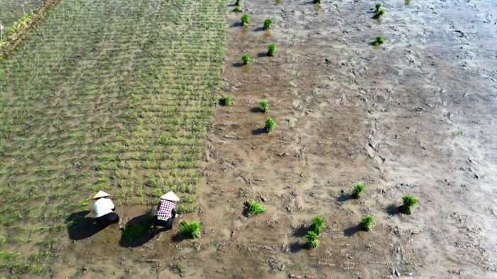 4月25日,农民在广西来宾市忻城县城关镇都乐村田间进行早稻插秧(无人机照片)。新华社发(樊绍光摄)