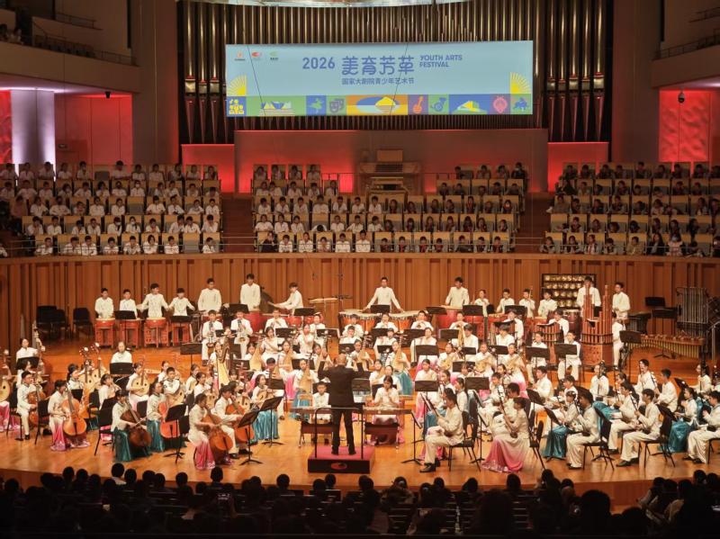 4月27日,2026年“美育芳草”青少年艺术节在国家大剧院正式开幕。此次活动由北京市教育委员会与国家大剧院联合主办。著名指挥、“美育芳草”艺术顾问刘沙携手中国音乐学院附属北京实验学校金帆民乐团、北京市第五中学金帆民乐团联袂献艺,以铿锵悠扬的民族管弦乐奏响本届艺术节序曲。