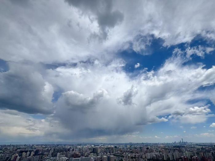 大块云团明暗层次分明,或如淡墨漫染天际,或似棉絮层叠舒展,部分云底垂挂淡淡雨幡,远处西山层峦、中央电视塔、国贸建筑群在云隙间次第显露,城景与云天相映成画。