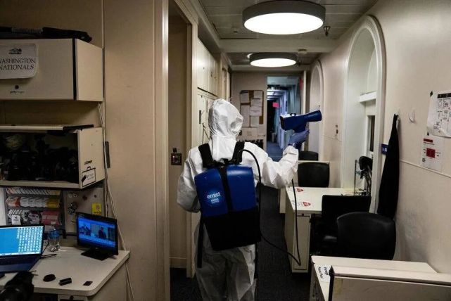 本周,包括简报室在内的白宫部分地区就像是一个危险区域,图为身着全套防护服的工作人员在对公共场所进行消毒