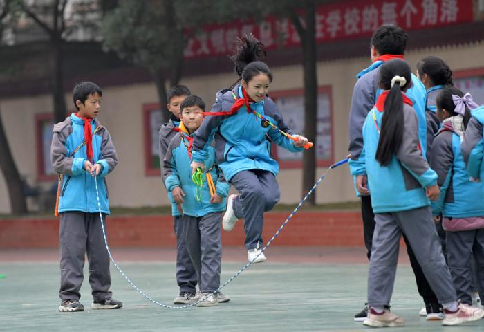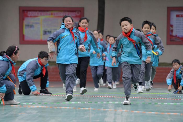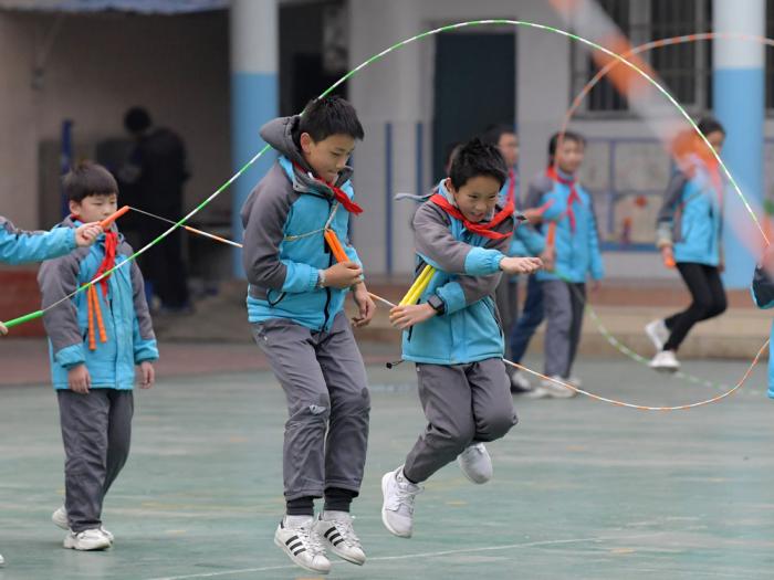 12月11日,学生们在大课间准备开展跳绳活动。 近年来,江西省南昌市青云谱区曙光小学引进专业教师,强化大课间与特色体育教学相结合,创立“绳韵”特色课程,打造花样跳绳体育大课间,通过速度跳绳、花样跳绳、团体跳绳等项目,培养学生健康的体魄和团队协作精神。