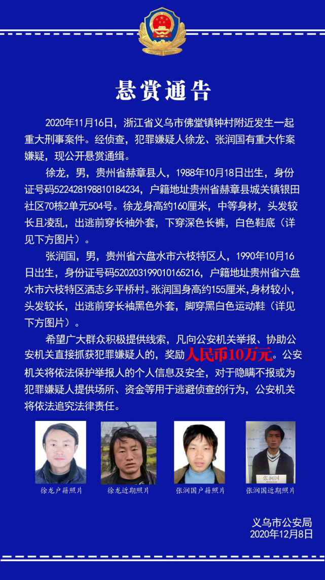12月8日,浙江义乌市公安局曾发布悬赏通告称,2020年11月16日,浙江省义乌市佛堂镇钟村附近发生一起重大刑事案件。经侦查,犯罪嫌疑人徐龙、张润国有重大作案嫌疑,现公开悬赏通缉。