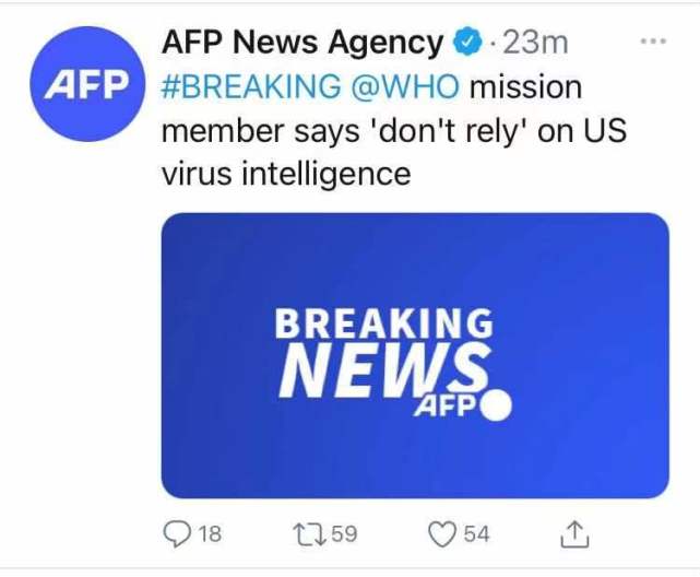 据法新社消息,专家组成员彼得·达扎克(Peter Daszak)在推特上说:“请不要太依赖美方情报:在特朗普的领导下越来越脱离接触。坦白地说,在许多方面都是错误的。”