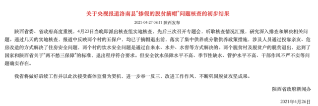4月26日,陕西方面发布了《关于央视报道洛南县“掺假的脱贫摘帽” 问题核查的初步结果》。