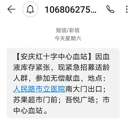 5日晚,安庆红十字中心血站通过短信推送到整个安庆市区的居民,因血液库存紧张,现紧急招募适龄人群,参加无偿献血。