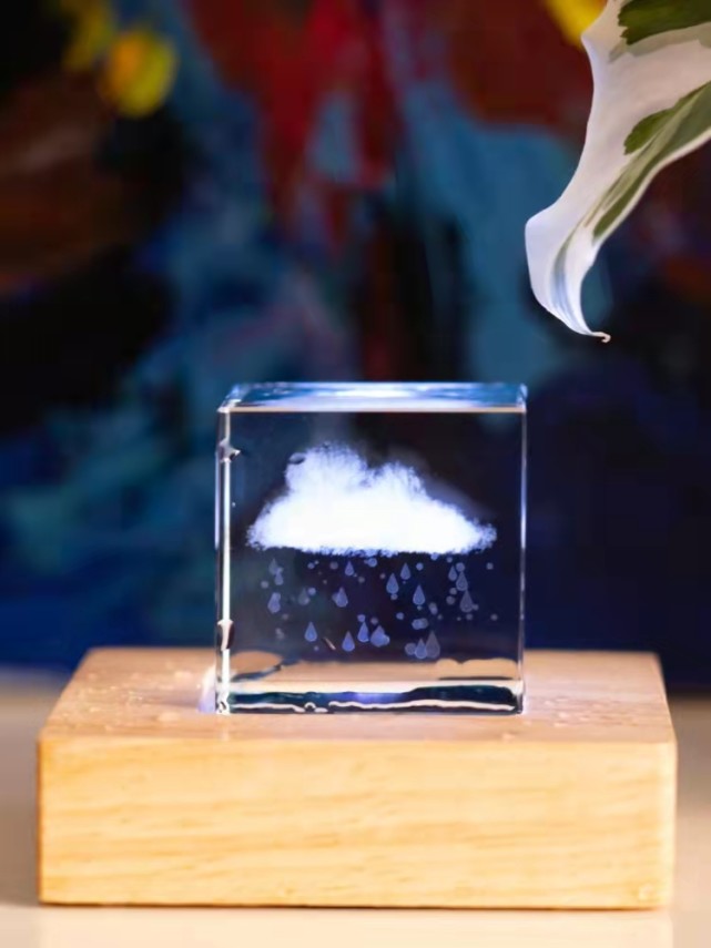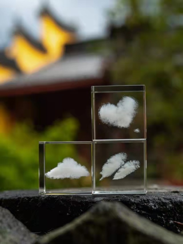 群友在聊天时经常感慨,如果可以拥有一朵云该多好。带着这样的初衷,卢沧龙开始做云的尝试。卢沧龙在实验室里用了两个多月的时间,试了很多材料,最终用滴胶建模,把云朵飘浮的样子复刻在透明立方体中。云朵创意摆件立刻受到了云友们的喜爱。让卢沧龙没想到的是,在云友圈外,云朵创意摆件也火了起来,越来越多的人来找他买。