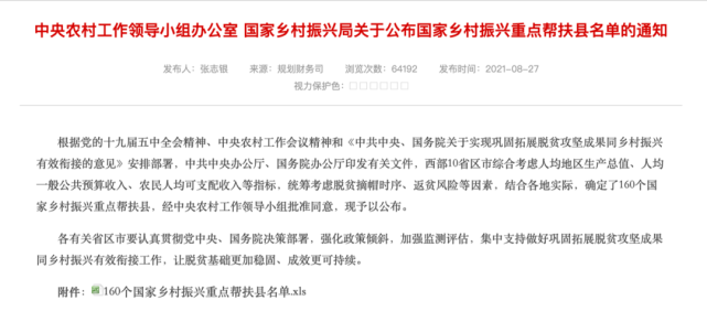 今年8月27日,中央农村工作领导小组办公室、国家乡村振兴局确定了160个国家乡村振兴重点帮扶县。