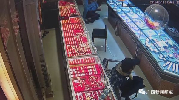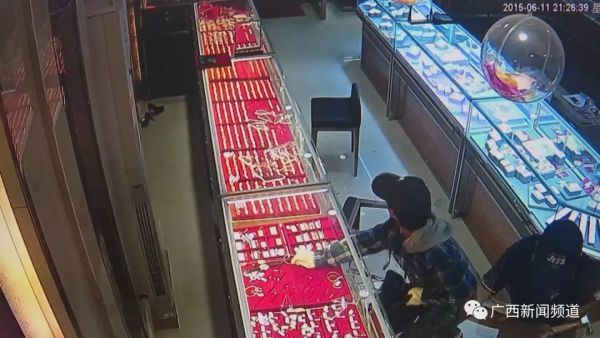 2015年6月11日晚上9点多,两名头戴黑色鸭舌帽的男子冲进了合浦县城的某家珠宝店铺。其中,身穿短袖黑色衣服的男子持刀架在保安的脖子上,威胁保安。另一名身穿长袖,蓝色格子外衣的男子持铁锤迅猛砸碎玻璃柜台取出部分黄金首饰装进袋子。随后,两人驾乘一辆没有牌照的摩托车迅速逃离现场。整个作案的过程仅30秒,涉案金额约52万元。