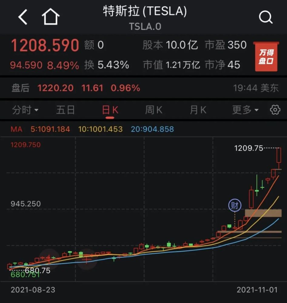 投资者的大肆追捧背后,特斯拉的股价及市值已经再创新高,突破了万亿美元。截至美东时间11月1日盘后,特斯拉每股股价1208.59美元,总市值达到1.21万亿美元。