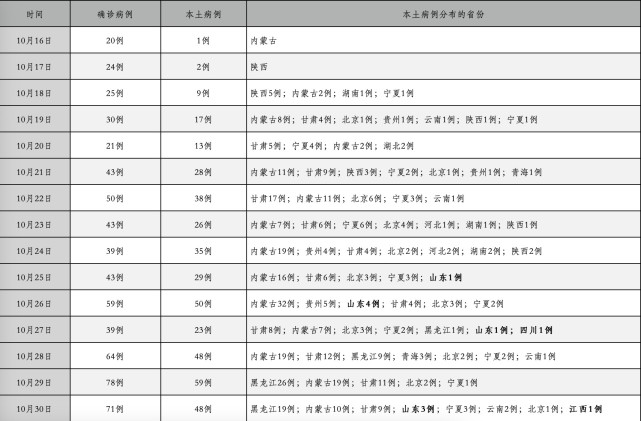 11月3日,31个省(自治区、直辖市)和新疆生产建设兵团报告新增确诊病例104例,其中本土病例87例,分布在11个省份,分别是黑龙江、河北、宁夏、江苏、河南、内蒙古、四川、甘肃、山东、重庆和青海。