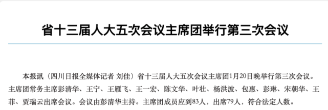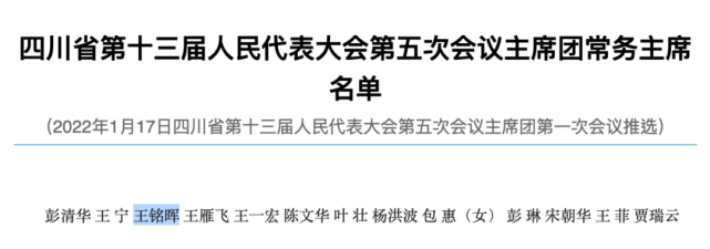 1月18日晚和1月20日晚,四川省十三届人大五次会议主席团举行第二次会议、第三次会议,王铭晖均缺席。