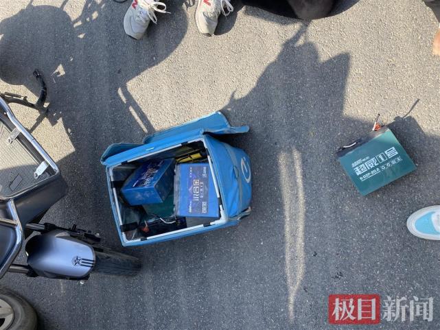 根据这一线索,3月9日下午2时,民警熊彪、辅警刘欢等人组成蹲守小组,悄悄在岱家山大桥处布控。果然,没过多久“外卖小哥”就骑着电动车出现了。面对警方的拦截,“外卖小哥”在慌乱逃跑时摔倒在地,电动车上的物品散落一地。民警上前查看,发现他的“外卖箱”内装着的根本不是外卖,而是满满一箱电瓶和工具!民警随即将他带回所内接受调查。