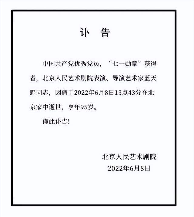 “七一勋章”获得者,北京人民艺术剧院表演、导演艺术家蓝天野同志,因病于2022年6月8日13时在北京逝世,享年95岁。