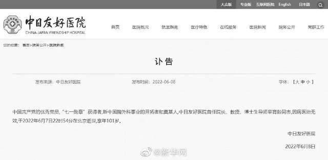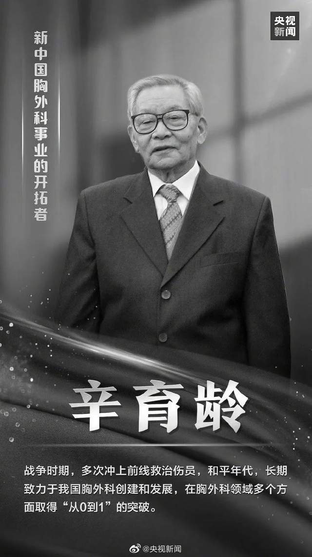 “七一勋章”获得者,新中国胸外科事业的开拓者和奠基人,中日友好医院首任院长、教授、博士生导师辛育龄同志,因病医治无效,于2022年6月7日22时54分在北京逝世,享年101岁。