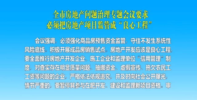 合肥的“全市房地产问题治理专题”会议提到,必须强化商品房预售资金监管,守住不发生系统性风险底线。