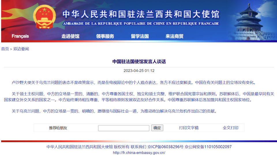 驻法使馆:卢沙野大使言论是个人观点表达
