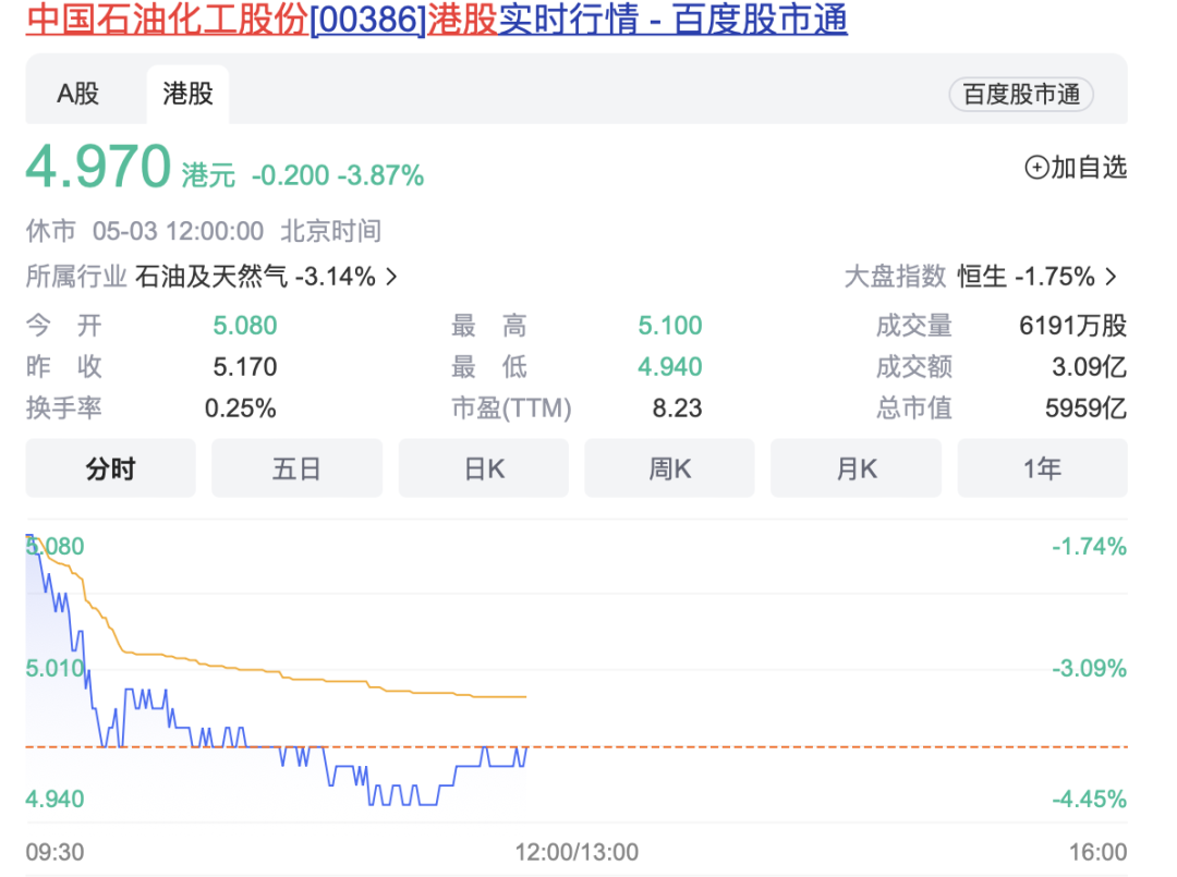 5月3日上午收盘,港股市场上中国石油化工股份跌近4%,中国石油股份跌4.25%,中国海洋石油跌3.16%,中海油田服务跌3.74%。