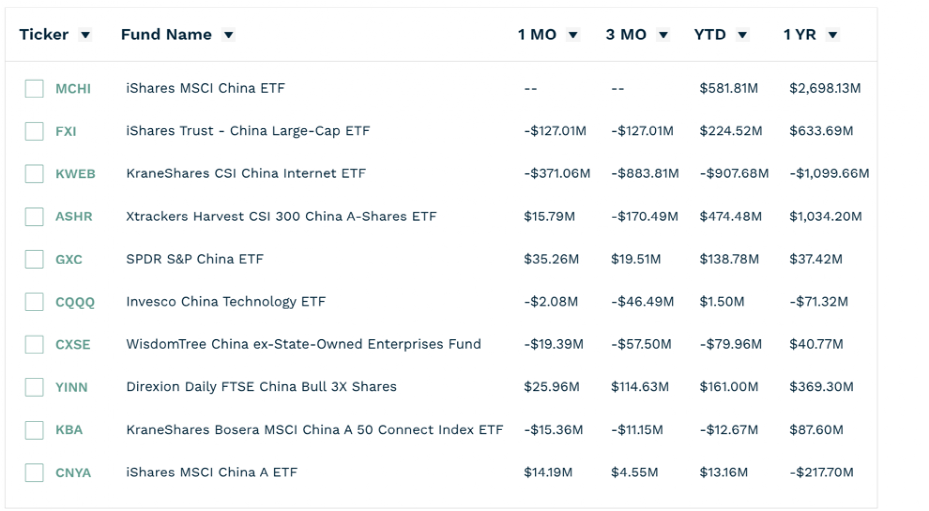 主动管理基金之外,我们再来看看海外上市的中国ETF。截至目前,海外前十大中国ETF为MCHI FXI KWEB ASHR GXC CQQQ CXSE YINN KBA CNY。过去一个月,ASHR、GXC、YINN、CNYA。 值得注意的是,此前的网红中国ETF-KWEB,今年持续遭遇资金流出。今年截至目前已经遭遇9.08亿美元净流出。截至目前,KWEB规模47.6亿美元,较峰值时近乎腰斩。KWEB今年净值亏损超过10个点,但是过去一年净值接近浮出水面,仅亏损0.71个点。