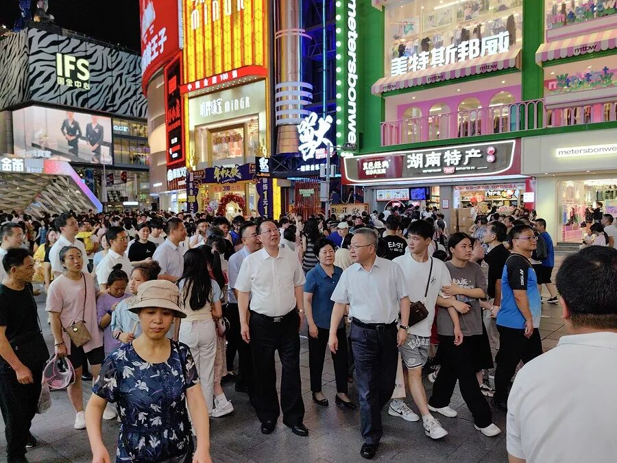 7月3日晚,沈晓明毛伟明一行来到五一商圈,沿着黄兴南路步行商业街边走边看,察看户外广告牌、疏散通道等存在的安全隐患