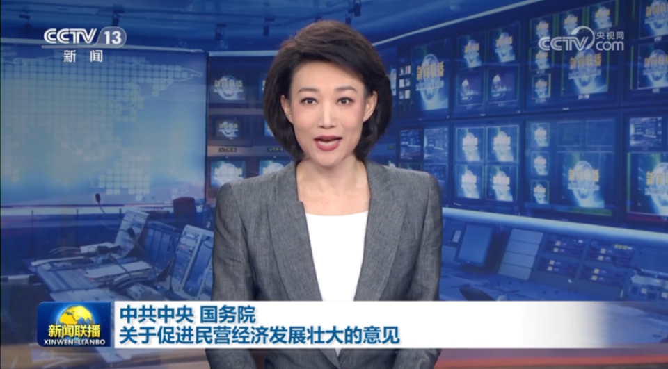 约3个月之后,7月19日,《新闻联播》发布消息,中共中央、国务院发布了《关于促进民营经济发展壮大的意见》。