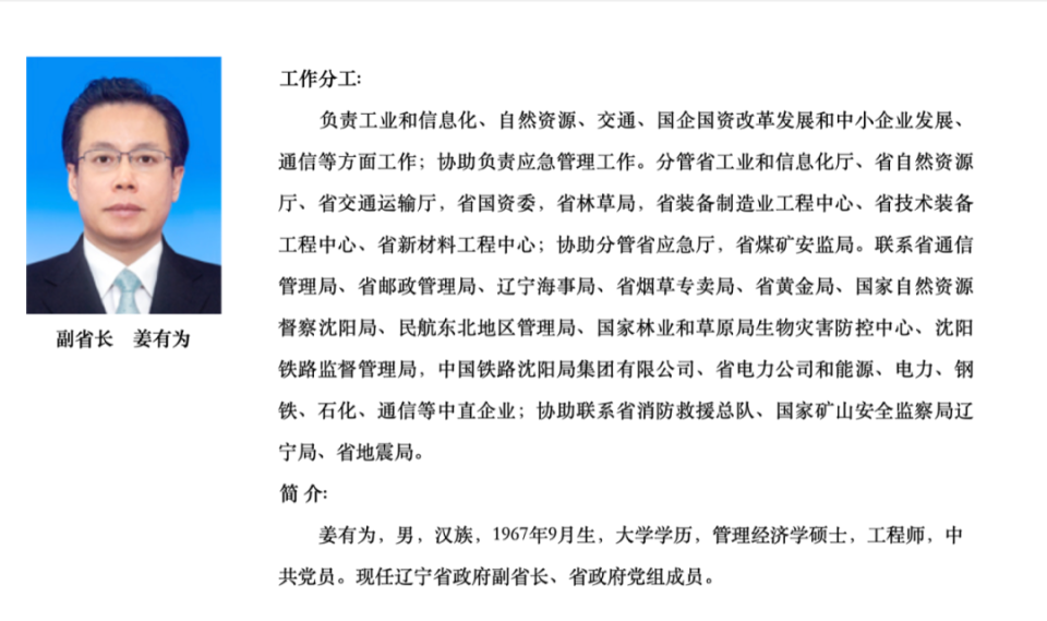 简历显示,姜有为先后在吉林省、辽宁省工作。