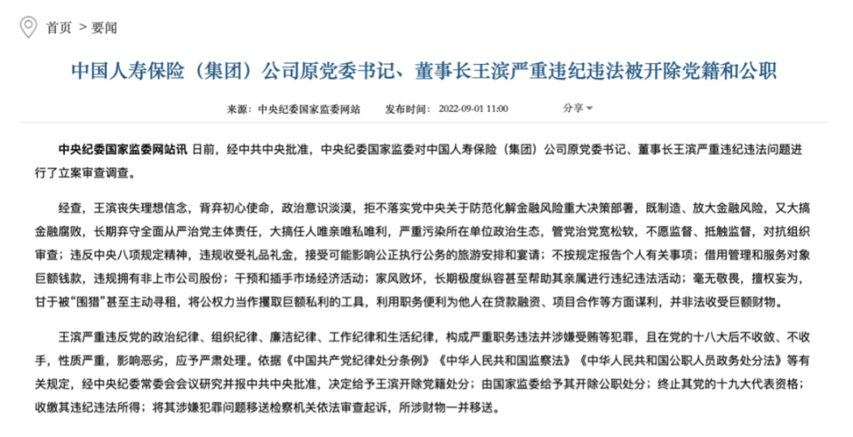 2022年9月,中国人寿保险(集团)公司召开党委扩大会议,通报中央给予王滨开除党籍、开除公职处分的决定。
