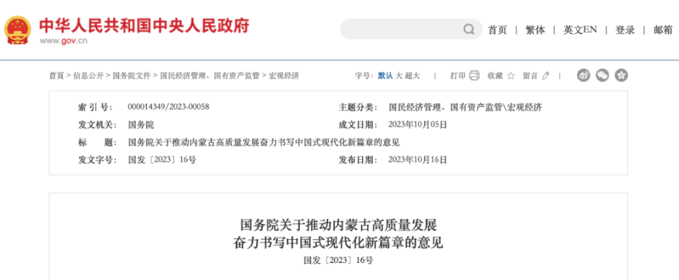 10月16日,国务院印发《国务院关于推动内蒙古高质量发展奋力书写中国式现代化新篇章的意见》。