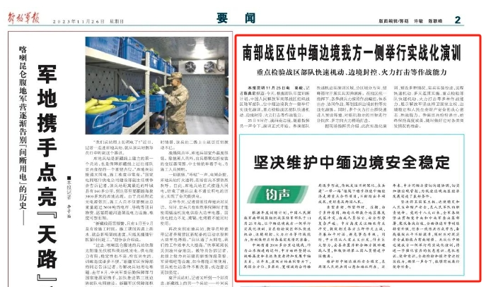 11月25日,“南部战区”公号发文称,根据年度训练计划,中国人民解放军南部战区组织陆军部队于11月25日起,位中缅边境我方一侧举行实战化演训活动,旨在检验战区部队快速机动、边境封控、火力打击能力。