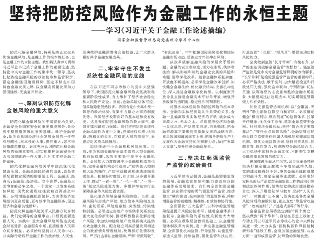 4月19日,国家金融监督管理总局党委理论学习中心组刊发题为《坚持把防控风险作为金融工作的永恒主题》的文章。