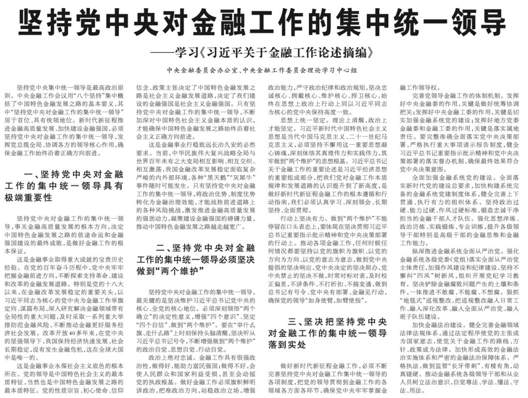 中央金融委员会办公室、中央金融工作委员会理论学习中心组在文中提到,坚决把坚持党中央对金融工作的集中统一领导落到实处。