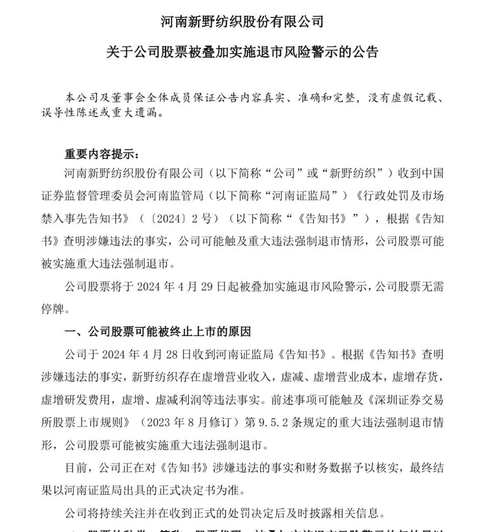 *ST新纺称,目前,公司正在对《告知书》涉嫌违法的事实和财务数据予以核实,最终结果以河南证监局出具的正式决定书为准。公司将持续关注并在收到正式的处罚决定后及时披露相关信息。