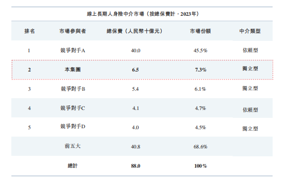 根据弗若斯特沙利文的资料,2023年,中国人身险中介市场的总保费达到人民币2370亿元。截至2023年底,中国有2592家保险中介机构,以国内人身险中介市场的总保费计,手回集团以68亿元的总保费排名第八,占2.9%的市场份额;以2023年线上长期人身险的总保费计,前五大参与者共贡献了68.6%的市场份额,其中手回集团以65亿元的总保费排名第二,占市场份额的7.3%。