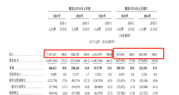 从财务数据来看,手回集团的总收入波动明显。2021年—2023年,手回集团收入分别为15.476亿元、8.063亿元、16.344亿元。2022年、2023年营收增幅分别为-47.90%、102.71%;2024年1-5月,手回集团的营业收入为6.03亿元,同比减少7.76%