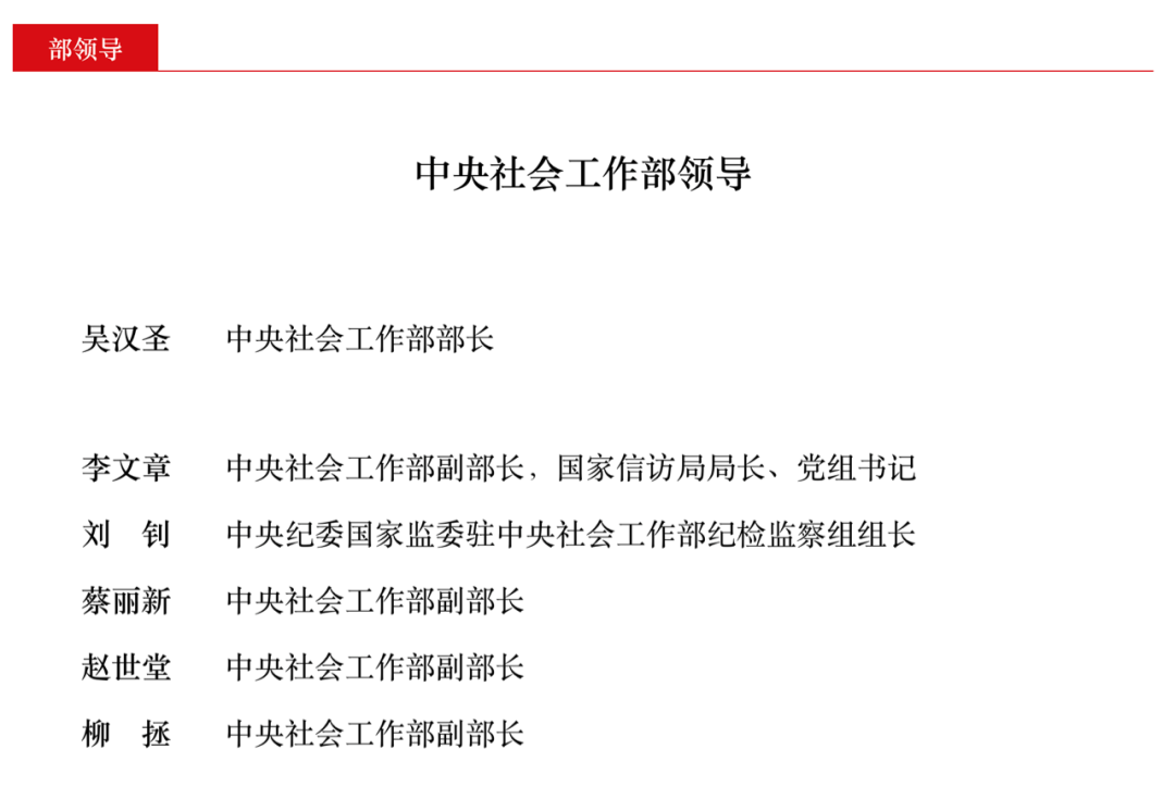 中央社会工作部门户网站“部领导”栏目,首次集中公布了中央社会工作部的6位领导名单。