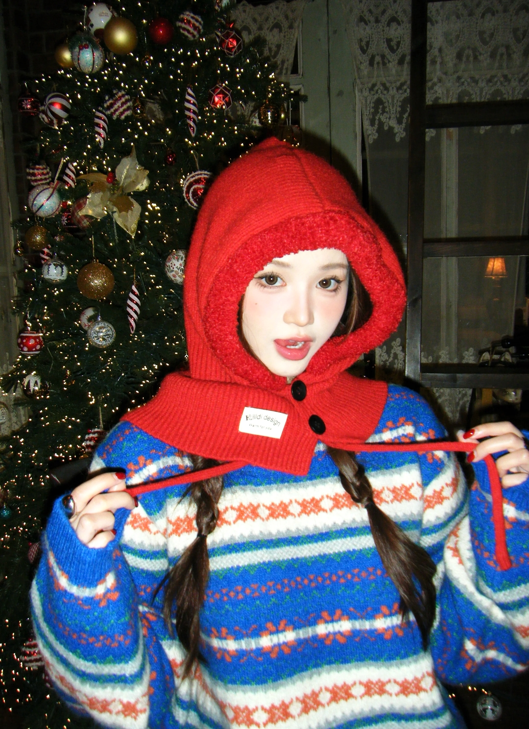 拍照出片不仅靠pose,一些出片的氛围感神器也必不可少,圣诞元素的麋鹿发箍,跟后面的圣诞树相称,复古的环境与复古的穿搭犹如置身千禧年的美国圣诞节。当然帽子也是出片秘诀之一,一顶圣诞气息浓厚的红色帽子让画面的视觉中心更加明显,亮度也有了显著提升。