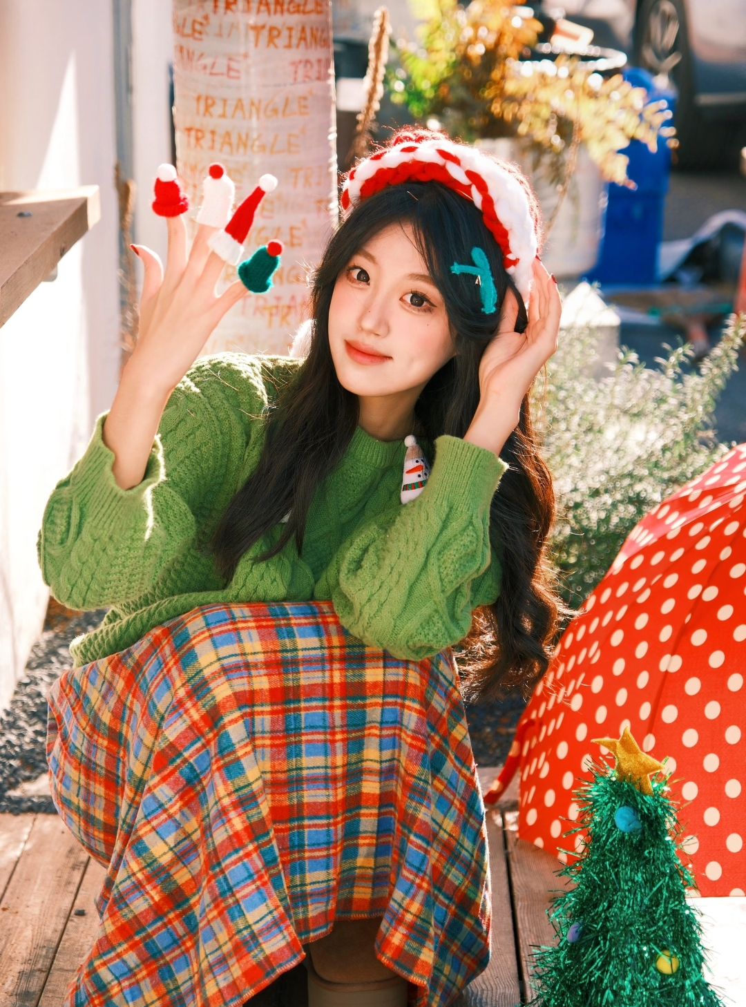 没遇到圣诞树怎么拍?将圣诞的元素提取出来,红色+绿色,选择服装搭配往这个色系上靠,绿色毛衣搭配红色格纹裙子。当然,一顶圣诞帽是必不可少的配饰。它不仅能够直接点明节日的主题,还能为你的穿搭增添一抹亮色,让整个造型更加完整、有趣。在这样的穿搭下,可以选择任意场所拍,无论是一些红绿色的小球还是小礼物都可以成为拍摄的道具。