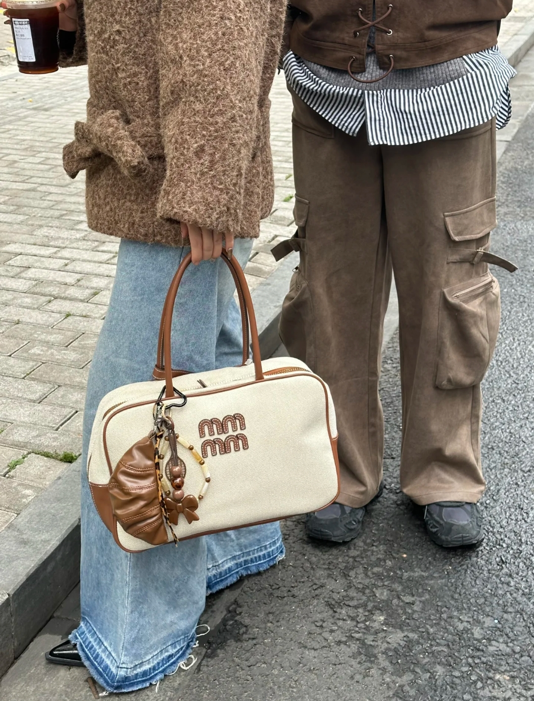 Miumiu的帆布包同样也是米白色帆布拼棕色皮质包边,包包自重轻,近年miu风盛行,网红博主都纷纷抢购,托特包款式和公文包款式各有千秋,托特包的长包型容量大,更显随意松驰,公文包的包型更加规矩,miu风甜美少女穿搭或是巴恩风穿搭,与这款包包的搭配都很时尚。