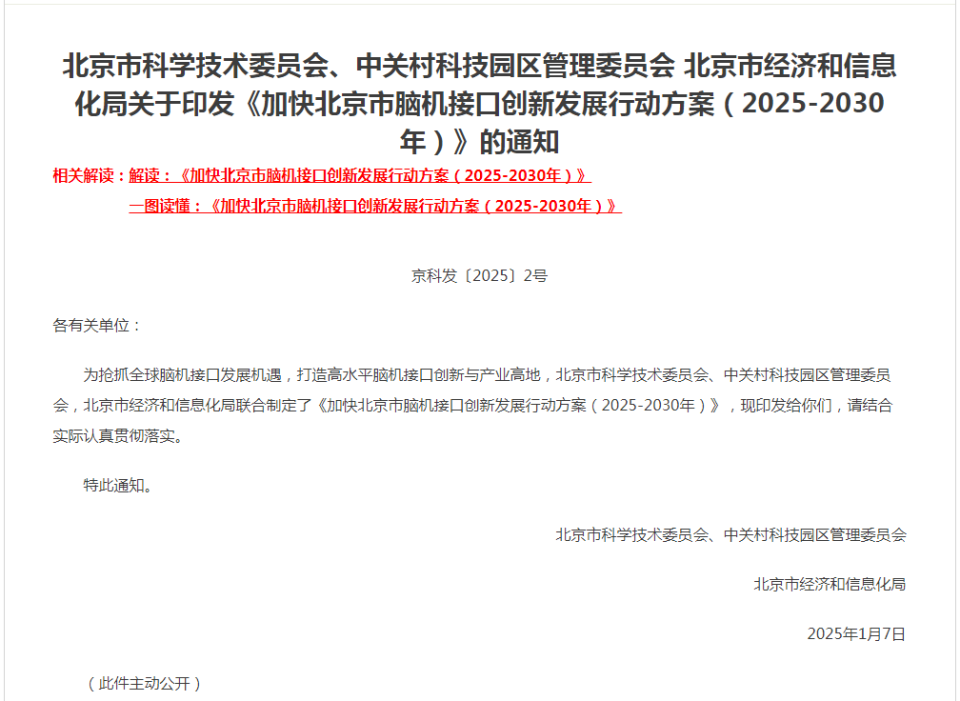 据北京日报客户端1月9日报道,北京市科委、中关村管委会官方微信公众号1月8日晚公布消息,《加快北京市脑机接口创新发展行动方案(2025-2030年)》近日印发。