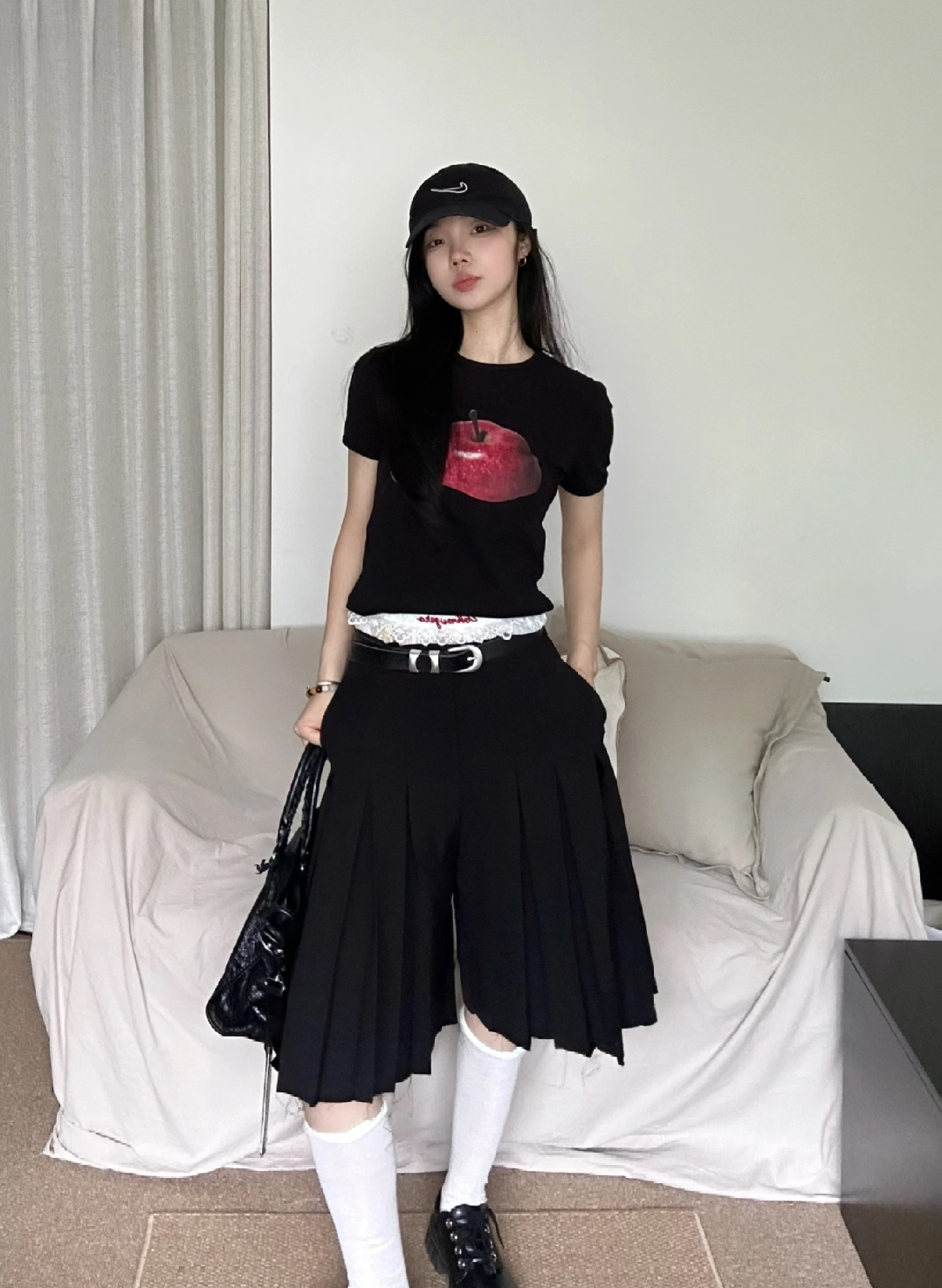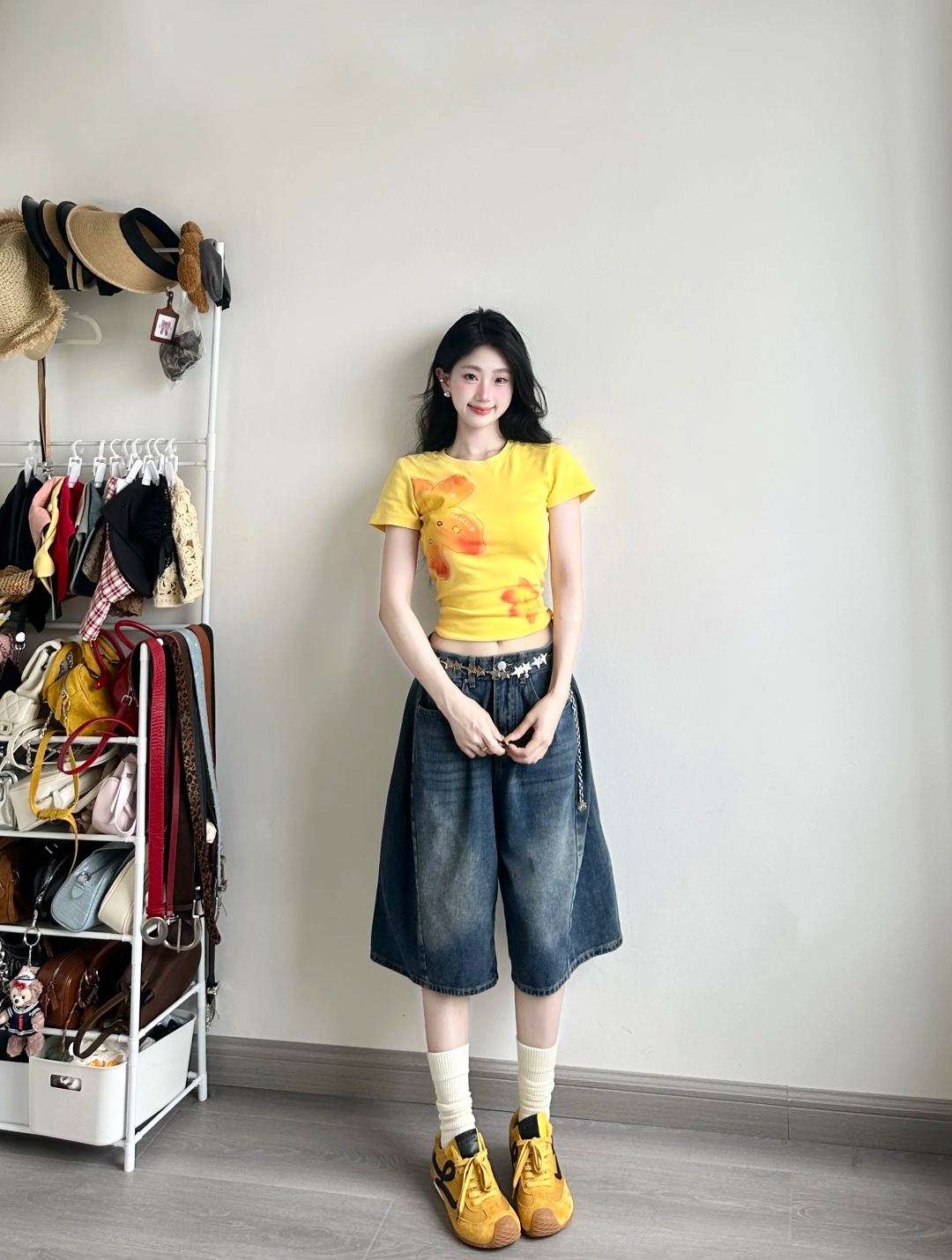 小个子女生穿中裤可以选择更长一点的八分裤,上衣选择短款crop top 或将普通 T 恤扎出 “衣角结”,进一步强调腰线。配饰上细腰带、前进帽等窄檐帽的小面积单品能起到纵向拉伸作用,让整体造型更显挺拔。