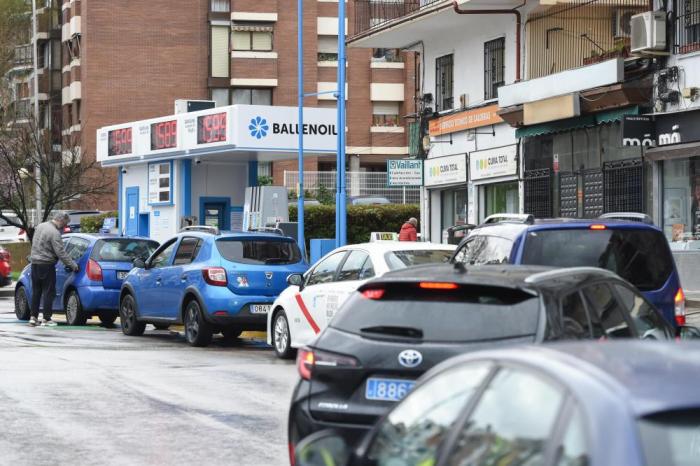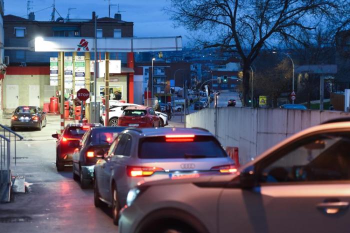 3月9日,车辆在西班牙首都马德里一处加油站排队加油。 新华社发(古斯塔沃·巴连特摄)